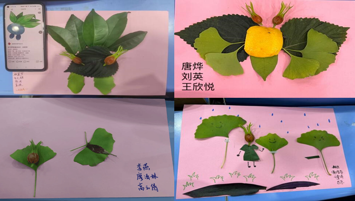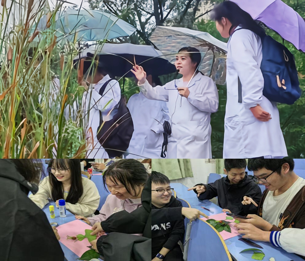 活动开始,同学们跟随专业教师来到百草园,听老师讲解中药材的相关知识,找寻已学中药的基源植物,认真观察药用植物在秋天的不同形态特征。随后采摘自己所喜欢的药用植物素材回到教室,进行二次创作。在班委带领下,自行组队,发挥想象力,利用卡纸、彩笔、胶水等辅助工具完成创作。