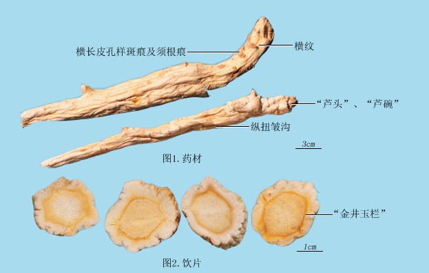 桔梗:质地脆、断面不平、层环为棕色、皮为黄白色、味微甜后苦。