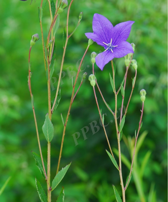 桔梗别名包袱花、铃当花、道拉基、符蔰、白药、利如、梗草、卢如、房图、荠苨、苦梗、苦桔梗、大药。本品桔梗首次收载于《神农本草经》,列为下品。《本草乘雅半偈》记载: “桔梗,如桔槔之梗,倾则仆,满则立,载上载下,其冯以枢,合入少阳少阴枢药也。”《本草求真》曰: “桔梗,专入肺,兼入心,胃,辛苦而平。”桔梗是药食同源的中药之一,种植广泛。茎高20-120厘米,通常无毛,偶密被短毛,不分枝,极少上部分枝。叶全部轮生,部分轮生至全部互生,无柄或有极短的柄,叶片卵形,卵状椭圆形至披针形,基部宽楔形至圆钝,顶端急尖,上面无毛而绿色,下面常无毛而有白粉,有时脉上有短毛或瘤突状毛,边缘具细锯齿。花单朵顶生,或数朵集成假总状花序,或有花序分枝而集成圆锥花序;花萼筒部半圆球状或圆球状倒锥形,被白粉,裂片三角形,或狭三角形,有时齿状;花冠大。蒴果球状,或球状倒圆锥形,或倒卵状,花期7-9月。