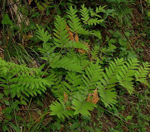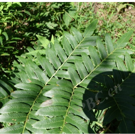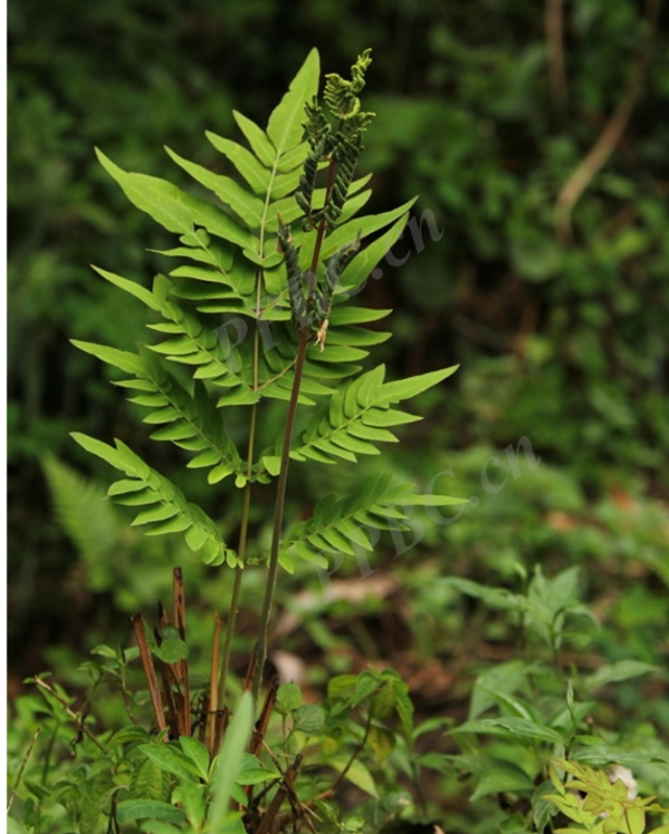 本品为紫黄科植物紫萁Osmunda japonica Thunb.,药材名为紫萁贯众,有高脚贯众、老虎牙、水骨菜、薇贯众和猫蕨等别称,在我国诸多药学古籍中均有记载,如《神农本草经》、《本草纲目》和《本草纲目拾遗》。紫萁根状茎短粗,或成短树干状而稍弯。叶簇生,直立,幼时被密绒毛,不久脱落;叶片为三角广卵形,顶部一回羽状,其下为二回羽状;羽片3-5对,对生,长圆形,基部一对稍大,斜向上,奇数羽状;小羽片5-9对,对生或近对生,无柄,分离,长圆形或长圆披针形,先端稍钝或急尖,向基部稍宽,圆形,或近截形,向上部稍小,顶生的同形,有柄,基部往往有1-2片的合生圆裂片,或阔披形的短裂片,边缘有均匀的细锯齿。叶脉两面明显,自中肋斜向上,二回分歧,小脉平行,达于锯齿。叶为纸质,成长后光滑无毛,干后为棕绿色。孢子叶(能育叶)同营养叶等高,或经常稍高,羽片和小羽片均短缩,小羽片变成线形,长1.5-2厘米,沿中肋两侧背面密生孢子囊。