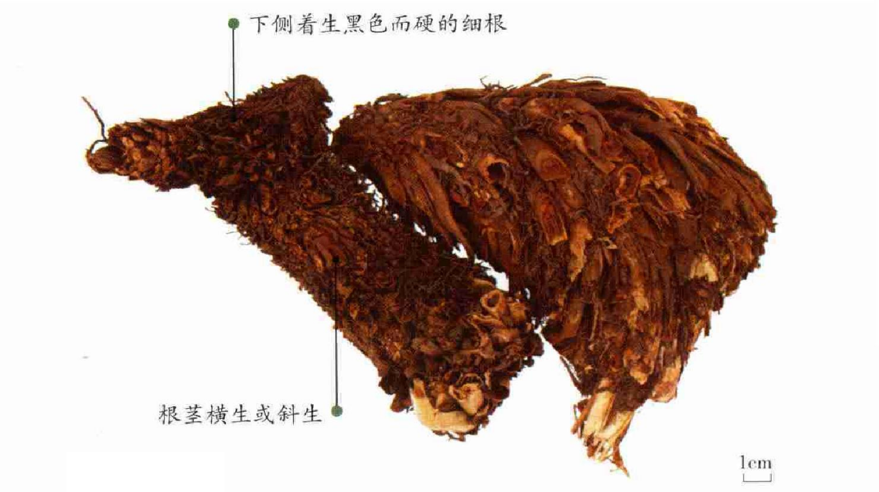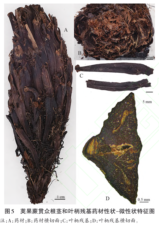 荚果蕨贯众:倒卵形或长倒卵形,长圆柱形,表面密被披针形叶柄残基,鳞片少或无,叶柄残基横切面类三角形,角质样,黑褐色至黄褐色,叶柄残基分体中柱2个,呈“八”字形排列。