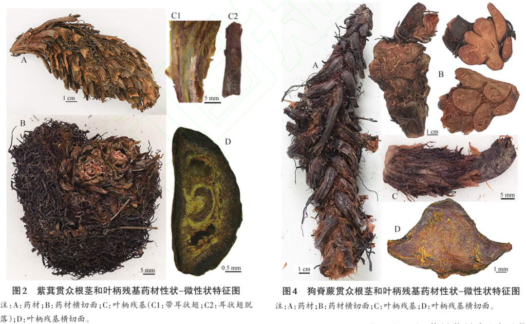 紫萁贯众:类圆锥形,表面下侧密生须根,上侧密生叶柄残基,无鳞片,叶柄残基横切面半月形,背面隆起,黄棕色至黑棕色,叶柄残基分体中柱5-13个,断续排列成环状。