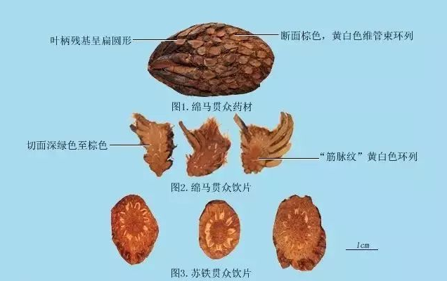 贯众来源众多,现版《中国药典》把鳞毛蕨科植物粗茎鳞毛蕨和紫萁科植物紫萁的干燥根茎及叶柄残基分别以“绵马贯众”和“紫萁贯众”之名列条收载,在我国多地均有分布;多秋季采挖,削去叶柄、须根,除去泥沙,切片,晒干。贯众药材性状气特异,味初淡而微涩,后渐苦,以个大、整齐、须根少者为佳,其炮制名称有贯众、贯众炭。绵马贯众又称为东北贯众,主产东北地区,功能清热解毒,驱虫,用于虫积腹痛,疮疡等症;紫萁贯众主产华中、华东等地,功能清热解毒,止血,杀虫,用于疫毒感冒,热毒泻痢,痈疮肿毒,吐血,衄血,便血,崩漏,虫积腹痛等症。