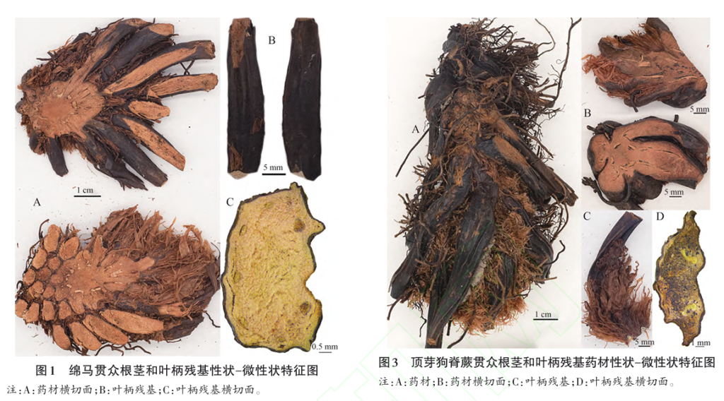 顶芽狗脊蕨贯众:近纺锤形或圆柱形,表面密布叶柄残基及鳞片,叶柄残基横切面类半椭圆形,两端较尖,密布黑色斑点,黄褐色至黄棕色,叶柄残基分体中柱5-8 个,2个较大,“八”字 形排列。