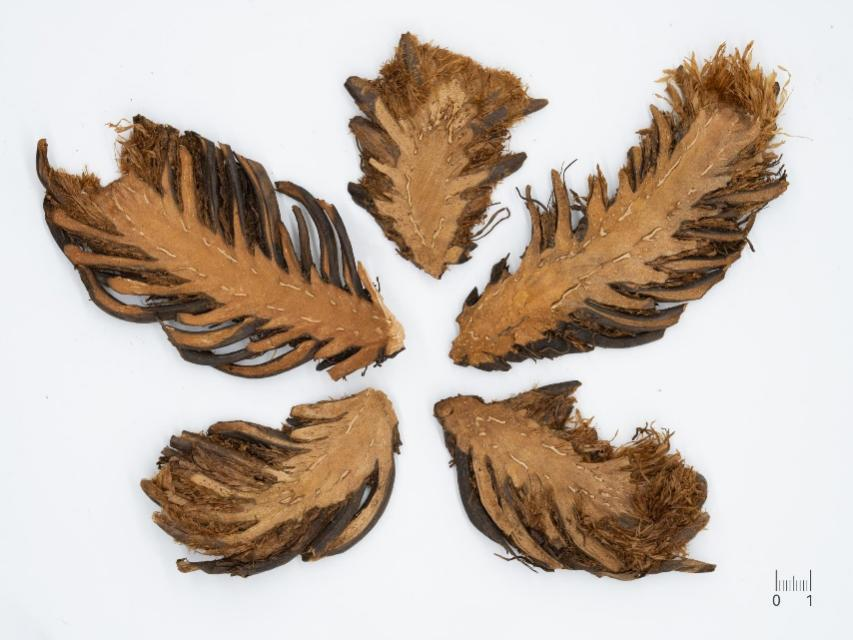 荚果蕨贯众:倒卵形或长倒卵形,长圆柱形,表面密被披针形叶柄残基,鳞片少或无,叶柄残基横切面类三角形,角质样,黑褐色至黄褐色,叶柄残基分体中柱2个,呈“八”字形排列。