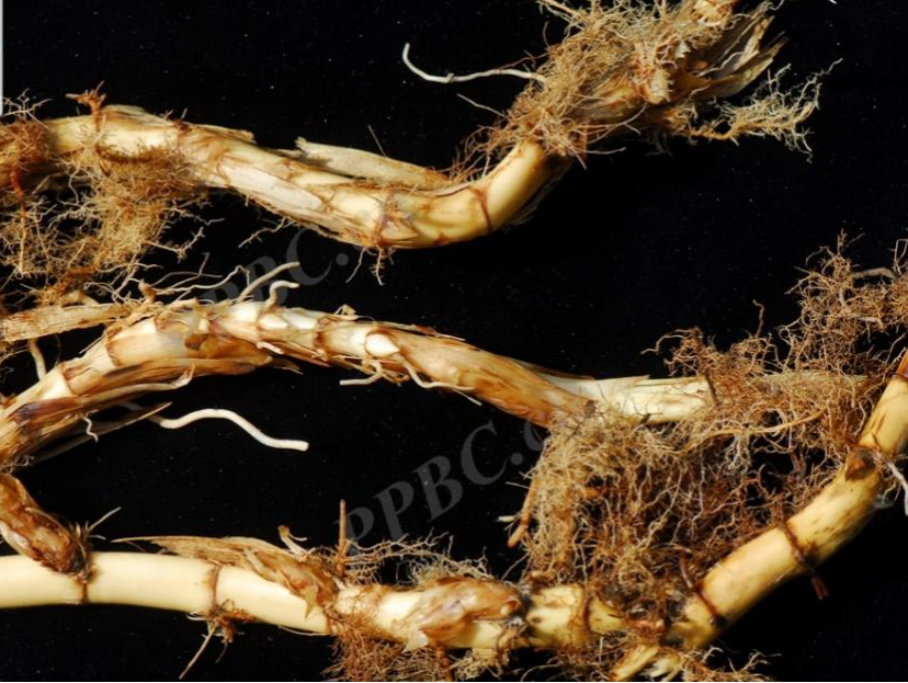 菰根:菰根为禾本科植物菰(Zizania caduciflora(Turcz.)Hand. - Mazz. )的根茎及根,呈扁带形,直径0.8~1.5cm,节呈环状,有残根及牙痕,节间距3~5cm,纵皱纹较明显。金黄色,具棕色色斑,无光泽。黄白色,中空,壁厚1mm。白色,光滑,节间具多个隔膜。体轻质软而柔韧,不易折断,纵向易撕裂,纤维性。气无,味微甘。