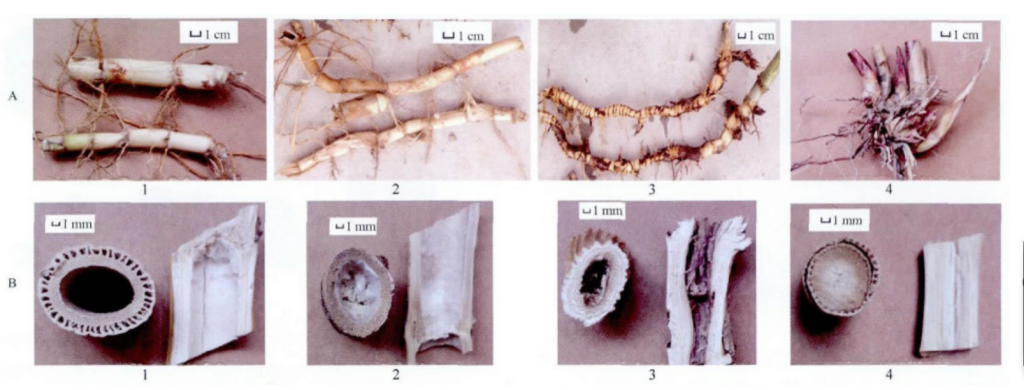 A.鲜品;B.干品横切面和纵切面;1.芦根;2.芦竹根;3.南荻根;4.芒根。