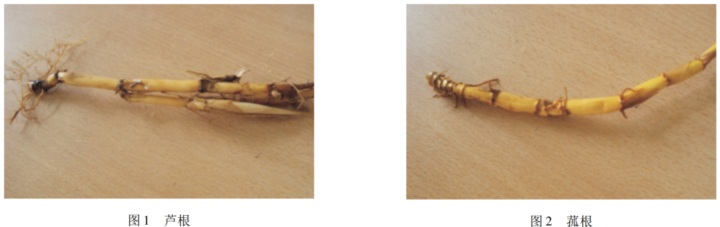 芦根:为芦苇属Phragmites Adans.植物芦苇P. communis Trin.的根茎,须根粗壮,鲜芦根呈长圆柱形,干时呈扁圆柱形,长短不一,直径1~2 cm,节间长1~9 cm,表面黄白色,具光泽和细纵纹,外皮疏松可剥离。有环状突起的节,节上有时可见残根及芽痕。体轻,质韧,不易折断。切断面黄白色,中空,壁厚2~3 mm,有小孔排列成环。气微,味甘。